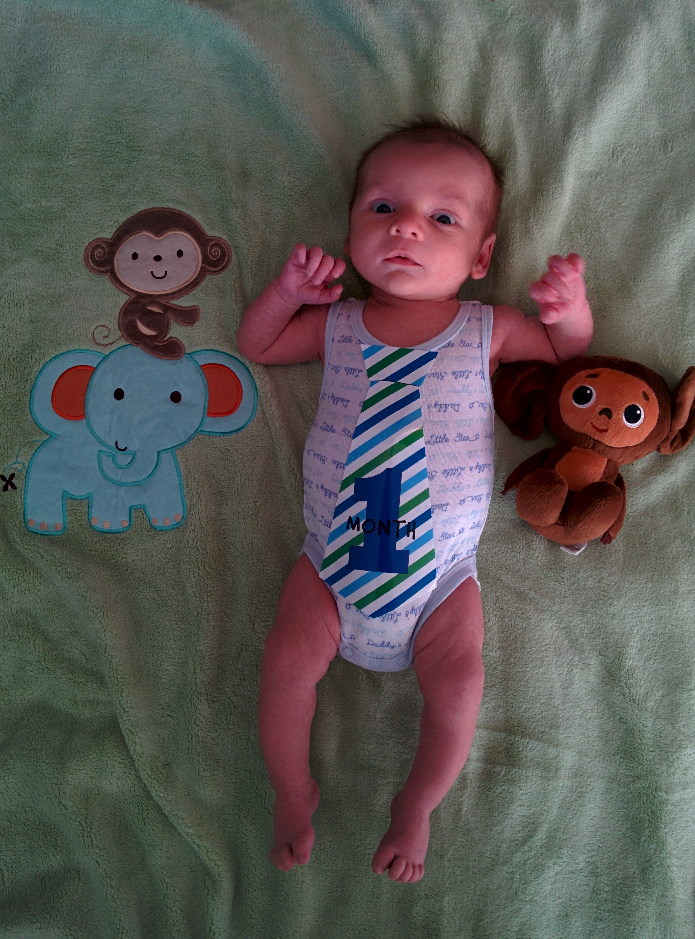 By One Month Old, our little man was 4.3kgs and 54cm long. He loved sleeping on his tummy (always falling asleep during tummy time), drinking lots and lots of milk, listening to Daddy talk (he always stopped and tried to listen to Daddy), music, showers and moving (whether he be moving himself or someone moving while holding him).