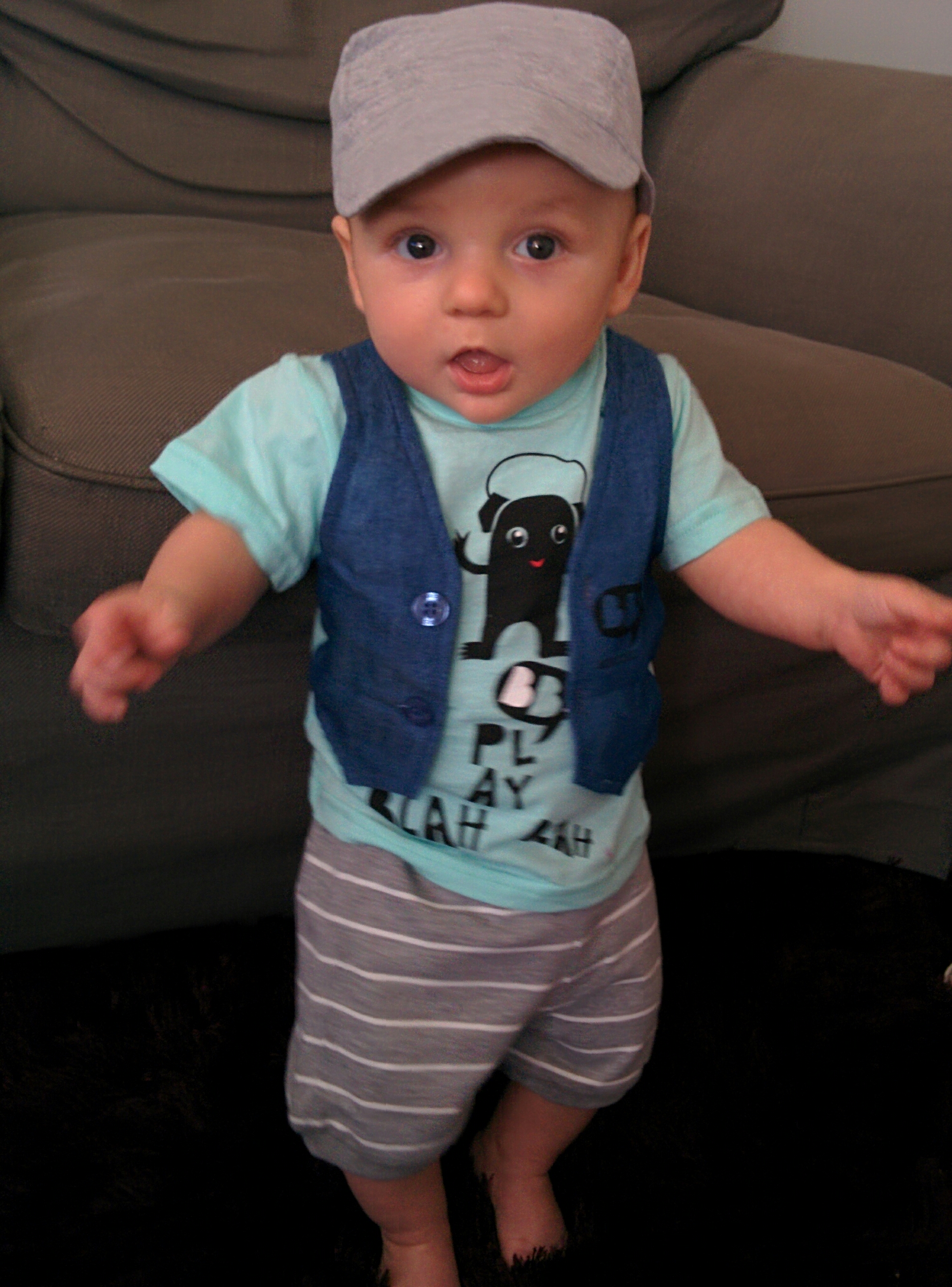 I love this picture! I love his outfit and his pose. I put this picture on Facebook and everyone was so surprised that our little man was standing all by himself. Obviously he is leaning on the couch behind him but he is soo strong and loves standing all day long.