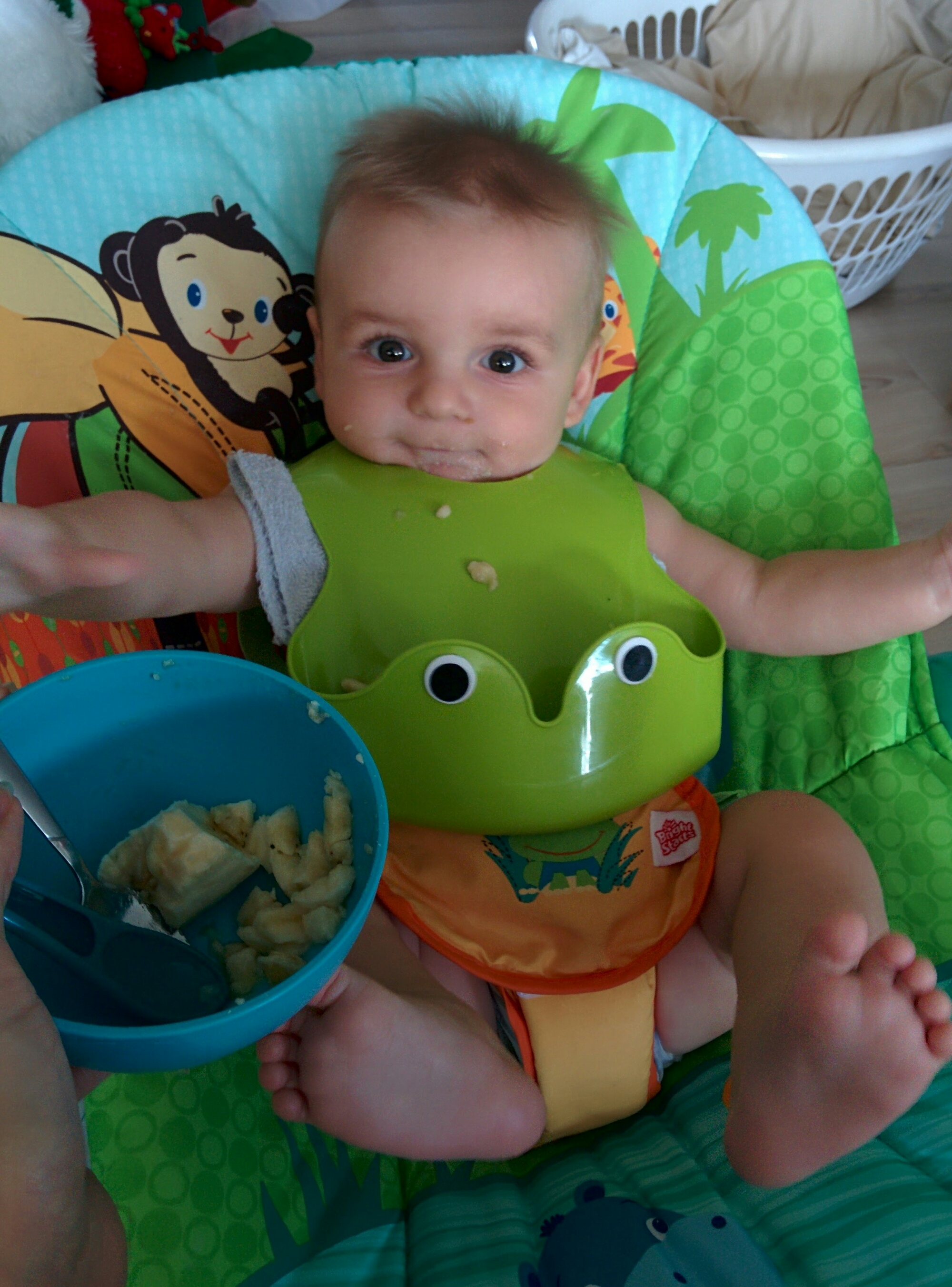 At around 6.5 months, our little man starting getting grumpy while we were feeding him. I was getting worried because I thought he might be going off solids. After a few days of this, I had a brainwave and gave him some chunks of banana instead of puree and he was much happier π so it turned out he had just decided he was too old for purees. Our big boy is so Mr independent.