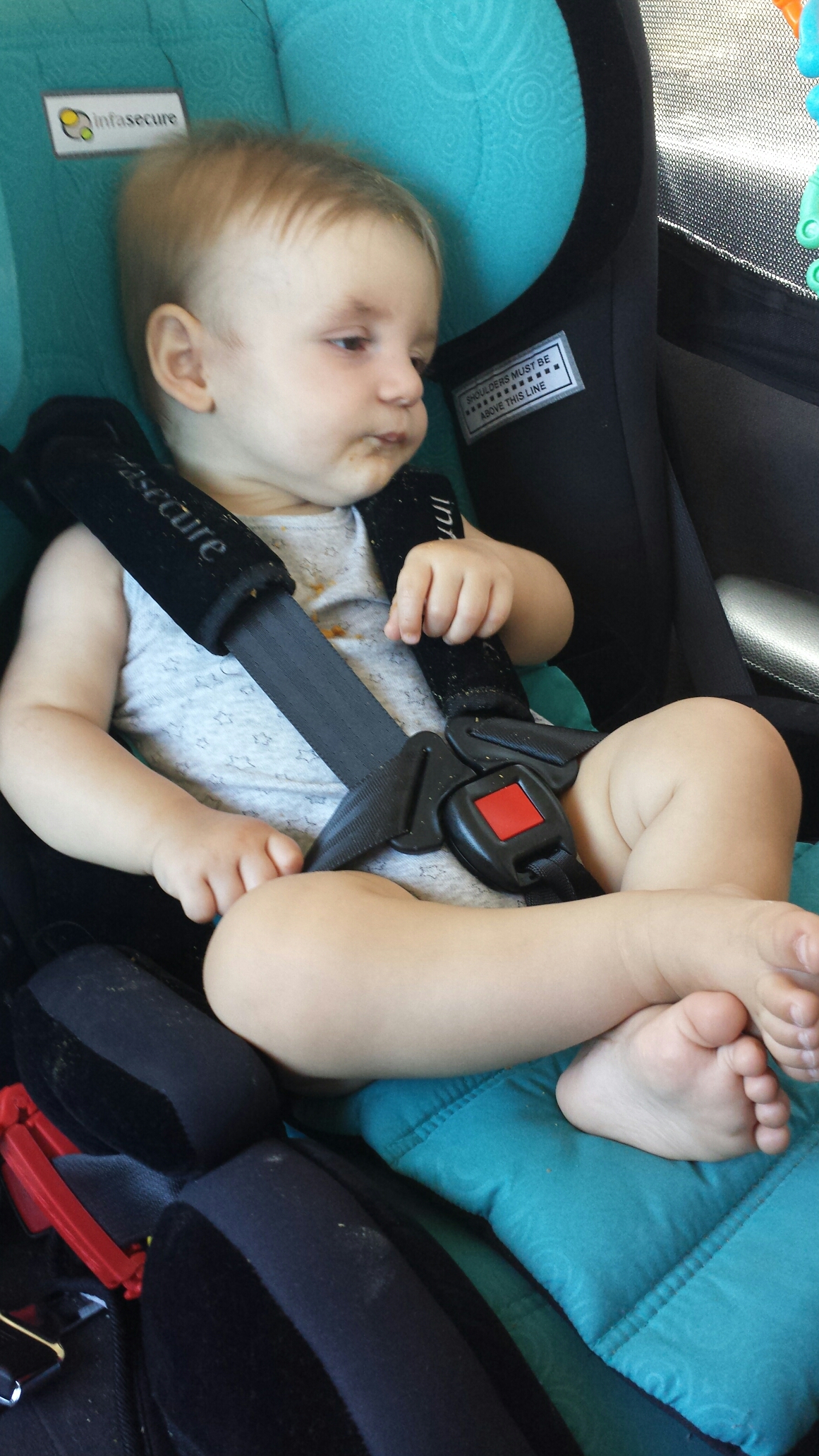 We are in a stage where our little man will only fall asleep while Breast feeding or in the car. Unfortunately this means he falls asleep at inopportune times. This picture is when I was trying to keep him awake by feeding him baby biscuits.