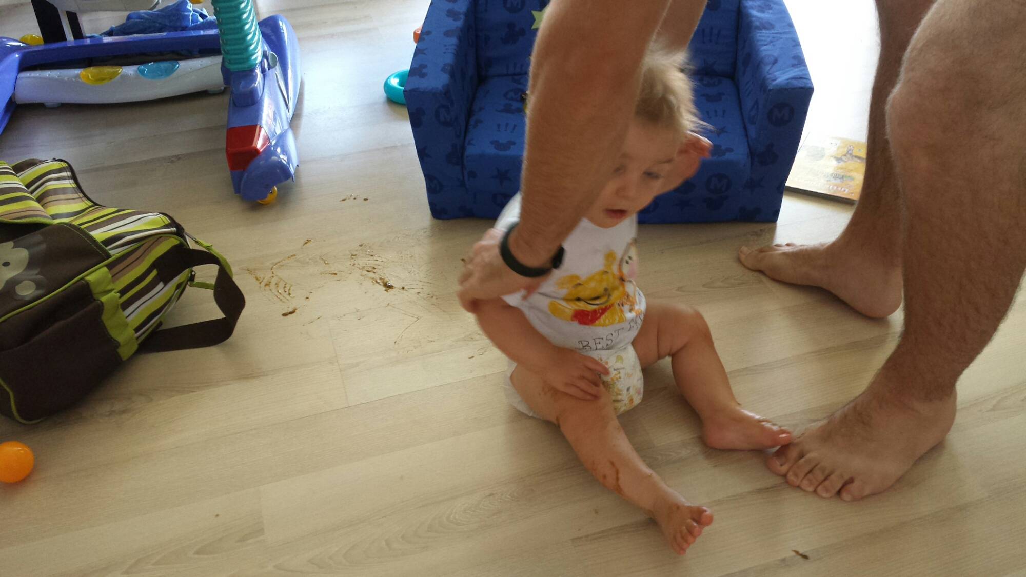 We were sitting watching TV when all of a sudden I looked up at Alfie trying to crawl towards me but his legs kept slipping. To my dismay, I realized he was covered in poo. His nappy had obviously leaked and he had been playing in it with his hands and feet for a while without us noticing.