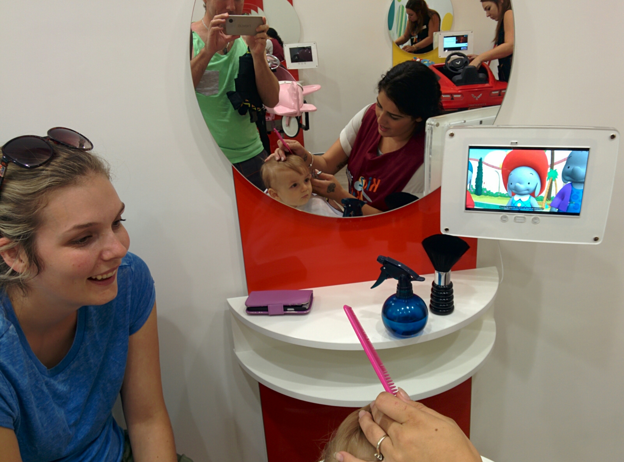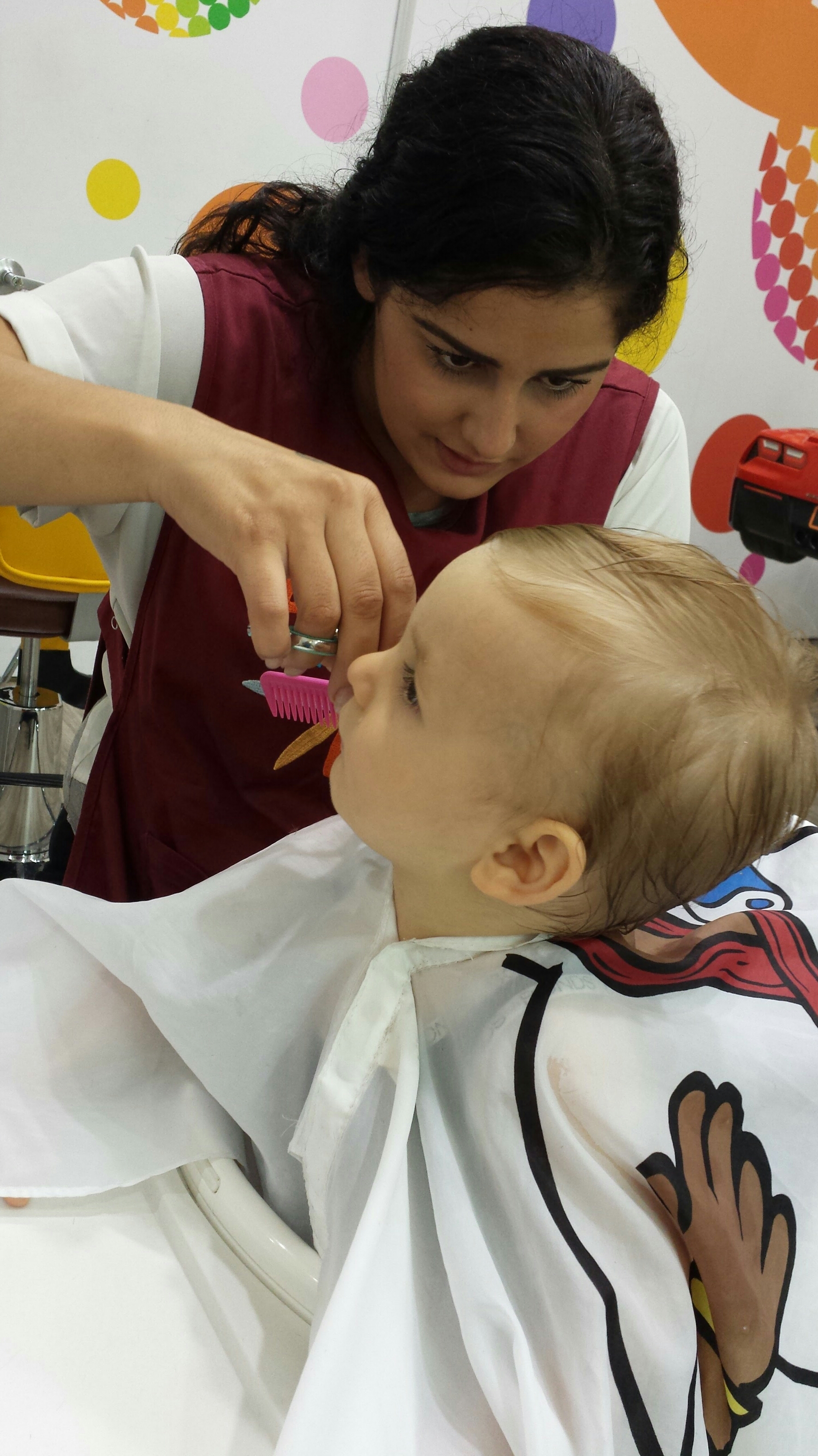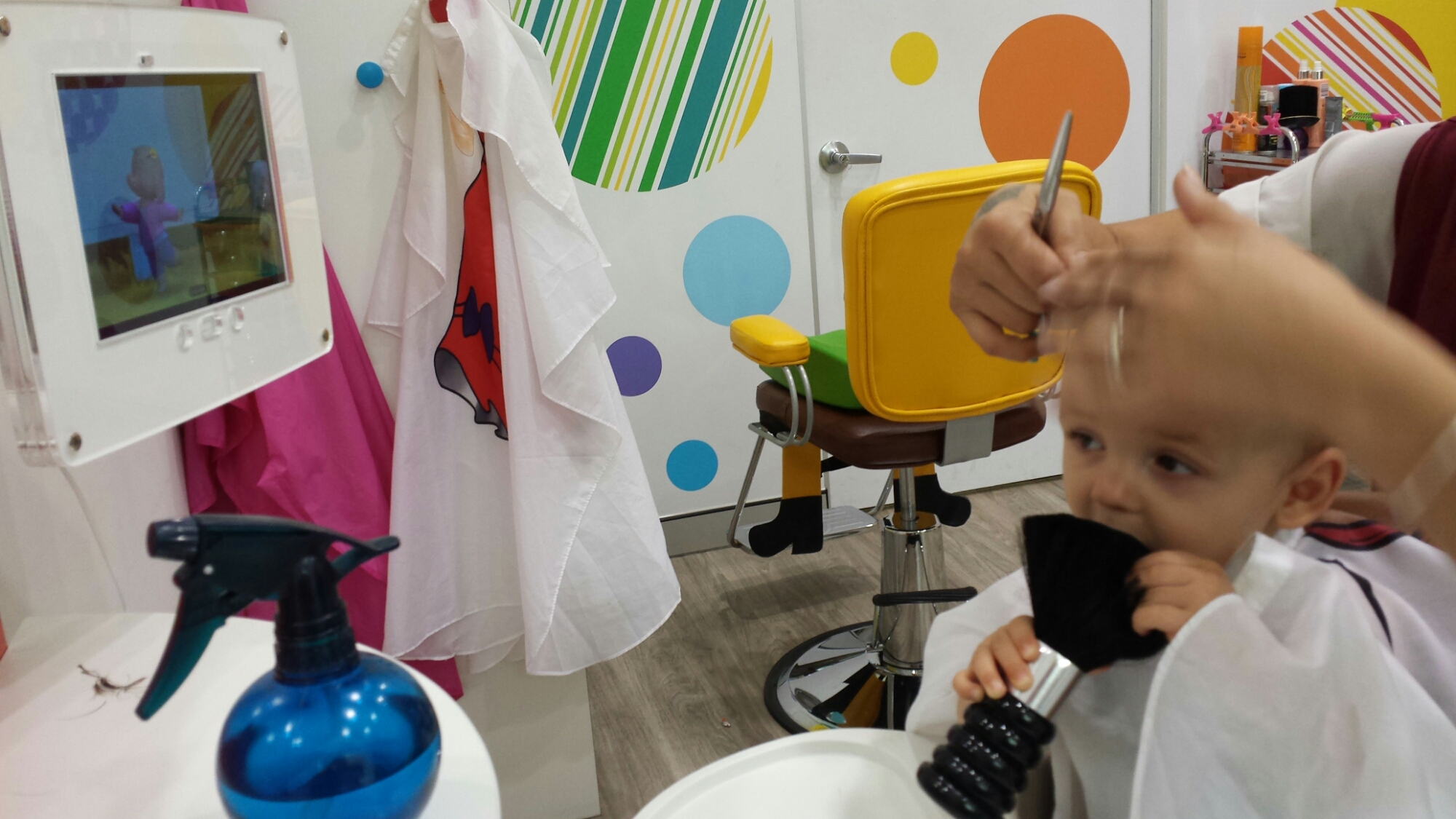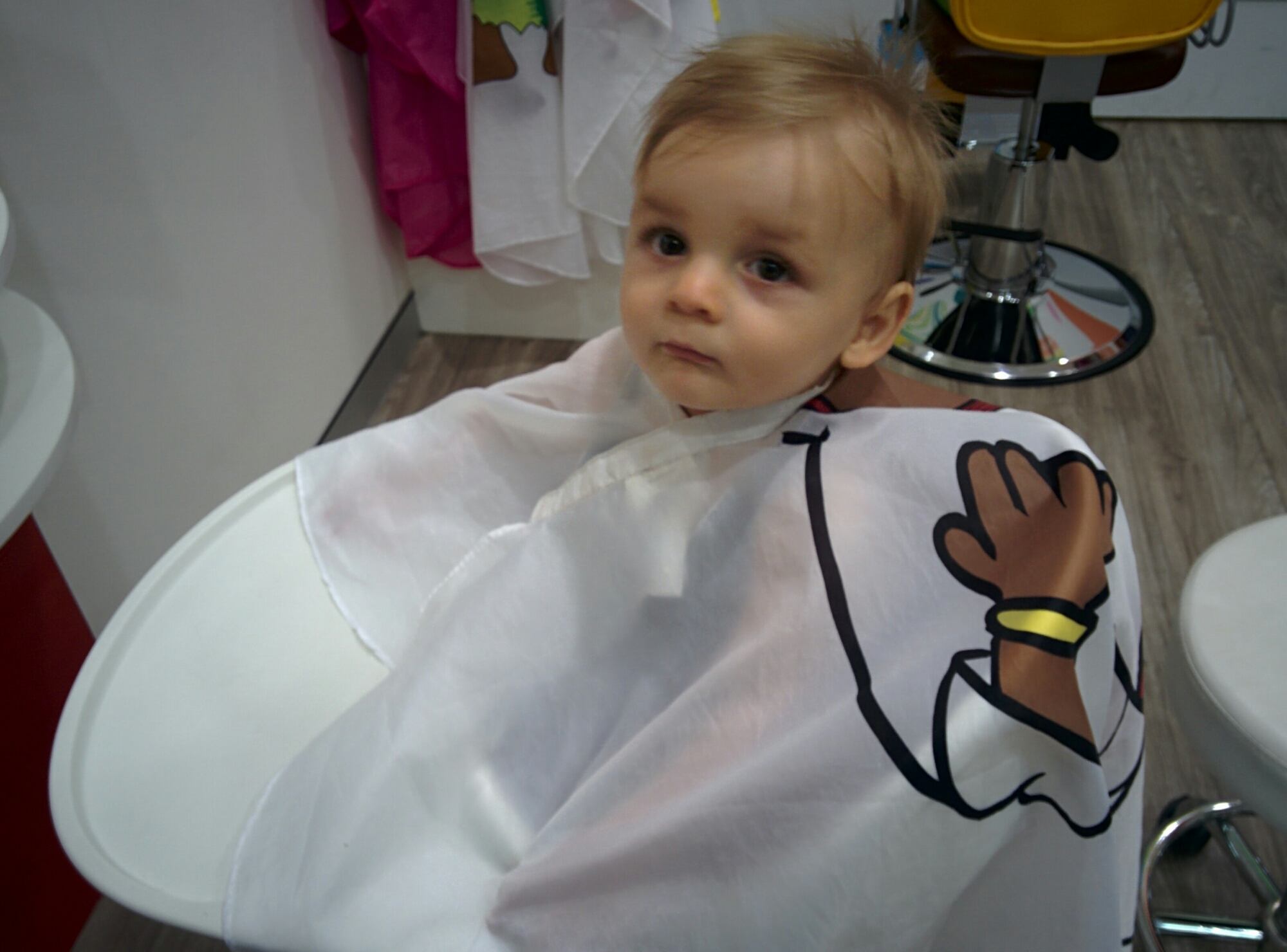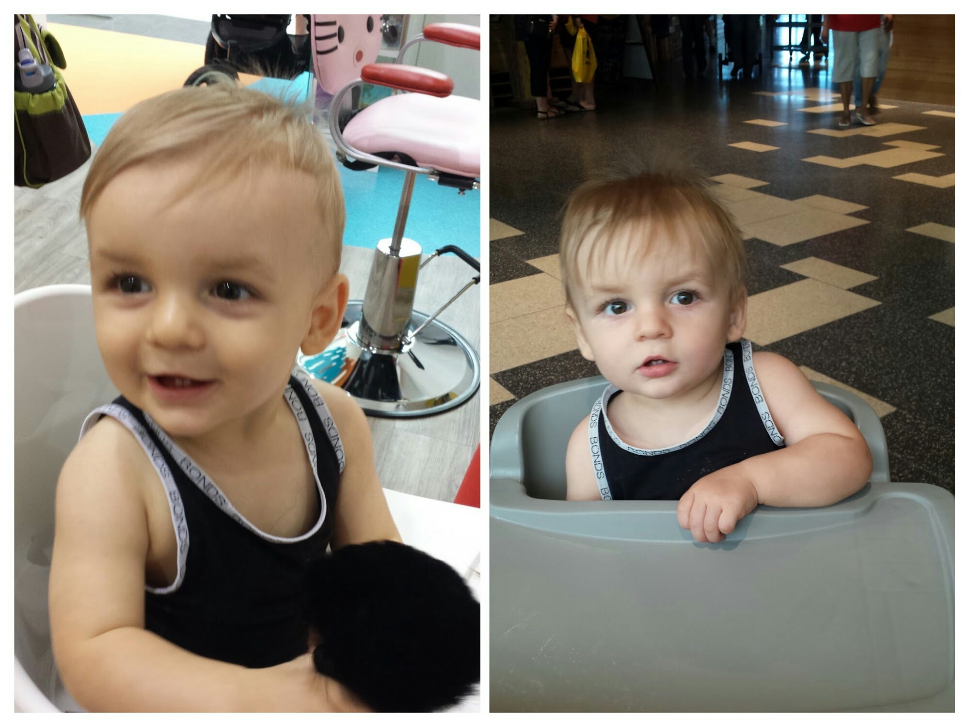 At 9.5 months, our little man’s hair had started to grow over his ears and was getting close to his eyes so we decided to get him his first haircut. We went to a place called Kidz Kutz. They have high chairs and kidz chairs and screens for them to watch TV shows on.