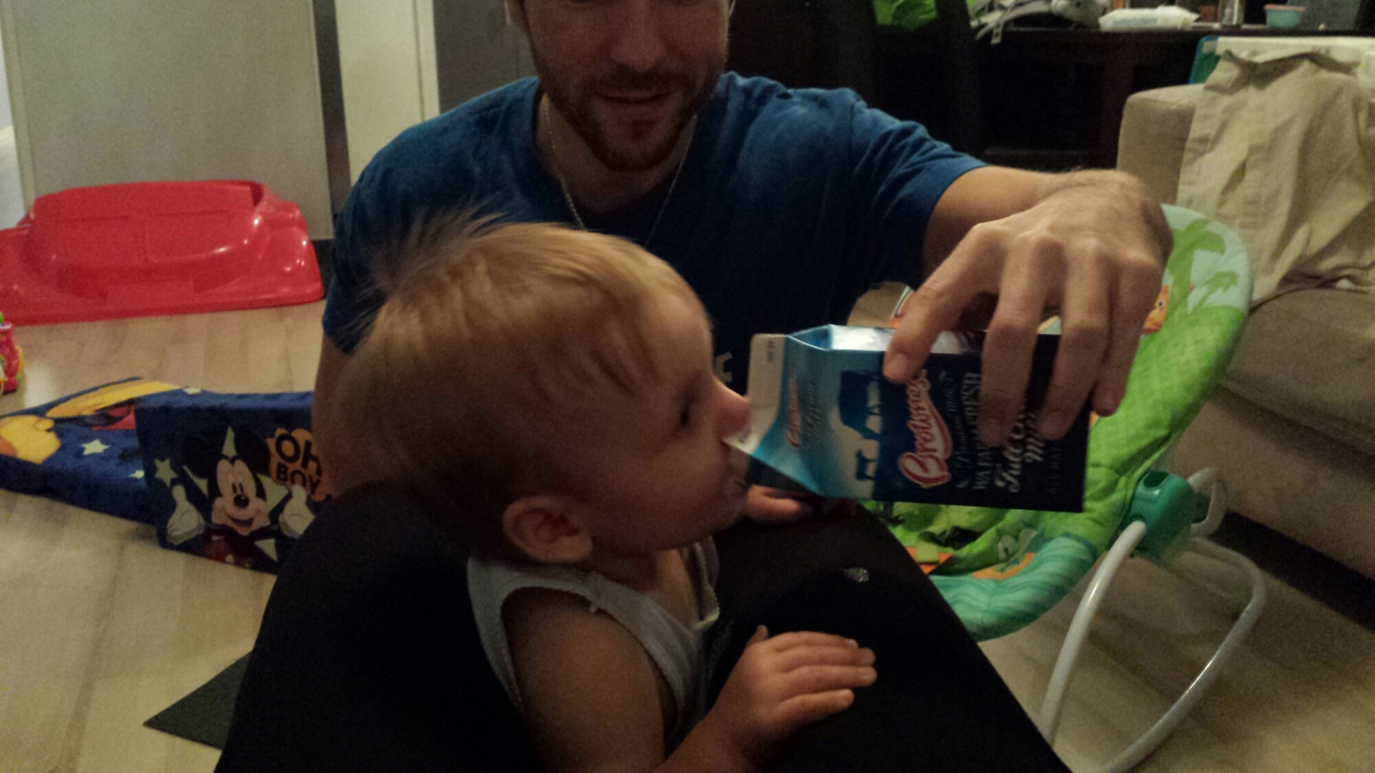Our little man had his first drink of Cows Milk just before he was 10 months. He has been having it on his rice cereal in the morning for about a month now but this was his first drink. Straight out of the carton of course lol